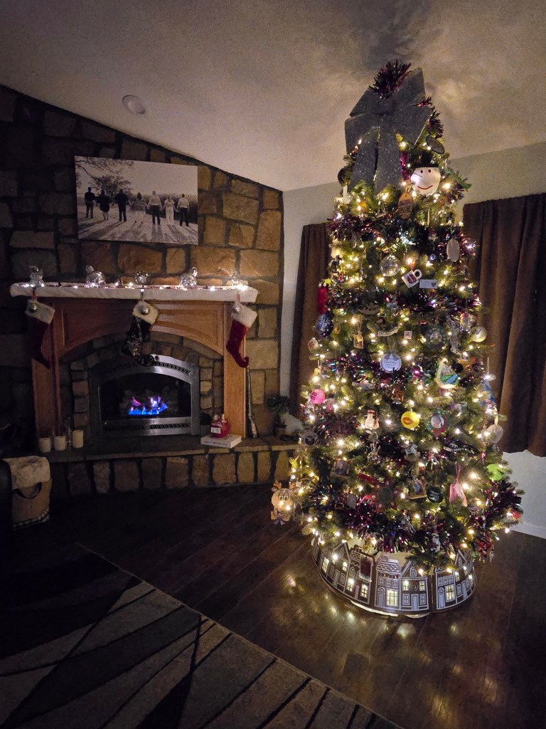 There’s nothing like the glow of a beautifully decorated Christmas tree set against the warmth of a crackling fireplace on a cold Texas day.🕯️🔥 My new tree skirt is so unique because it looks like a little illuminated village! And the stockings that I hung by the chimney with care are ready for their big day.